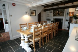 The theme of the lounge runs through to the dining room, with the exposed beams, fire place and