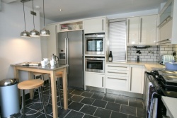 and Bosch dishwater, with a two oven oil fired Rayburn being the focal point. There is a high bar table and three stools,