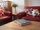 combining old exposed beams, stone fire place and slate floor, with a light, airy